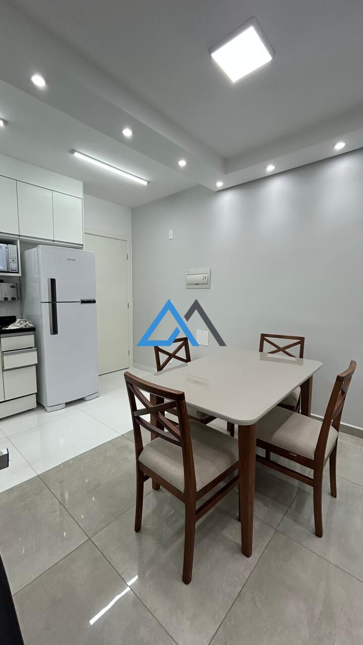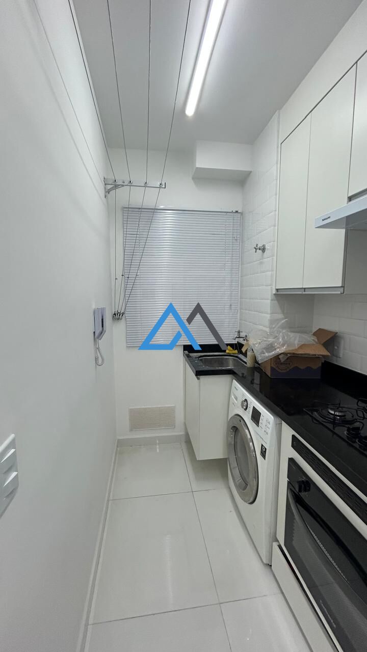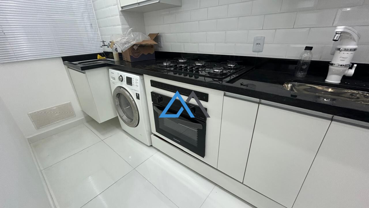 Totalmente mobiliado e equipado: torneiras elétricas na cozinha e banheiro, filtro de água, geladeira, ar-condicionado, sofá de couro, cortinas, TV, varal, mesa, espelho de luxo, cama com colchão, lava e seca, depurador de ar e móveis planejados nos dois quartos — tudo novo.